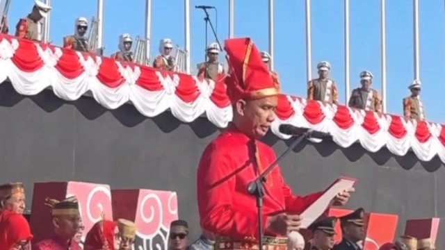 Makassar — Ketua DPRD Kota Makassar Rudianto Lallo dipercayakan membaca teks Proklamasi dalam Upacara Peringatan HUT RI ke-79 di Anjungan City of Makassar, Pantai Losari Kota Makassar, Sabtu (17/8/2024).