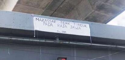 Tepat di atas lampu lalulintas Fly Over, terdapat spanduk dengan tulisan, “Makassar tidak tunduk pada Raja Jawa”.