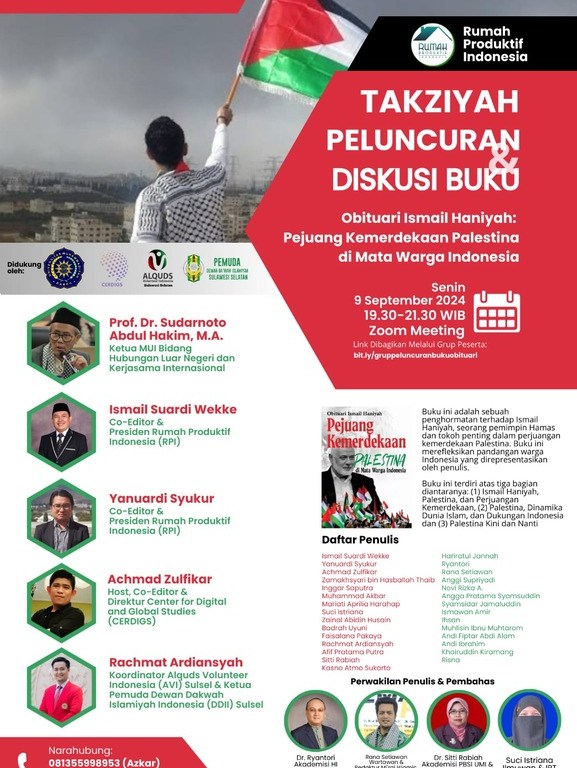 Memgenang 40 hari wafatnya Ismail Haniyah, pemimpin utama perjuangan kemerdekaan Palestina, Perkumpulan Rumah Produktif Indonesia (RPI) didukung oleh Penerbit Universitas Muhammadiyah Barru (Unmuh Barru), Center for Digital and Global Studies (CERDIGS), Alquds Volunteer Indonesia (AVI) Sulsel dan Pemuda Dewan Dakwah Islamiyah Indonesia Sulsel menggelar “Takziyah 40 Hari, Peluncuran dan Diskusi Buku Obituari Ismail Haniyah, Pejuang Kemerdekaan Palestina di Mata Warga Indonesia”.