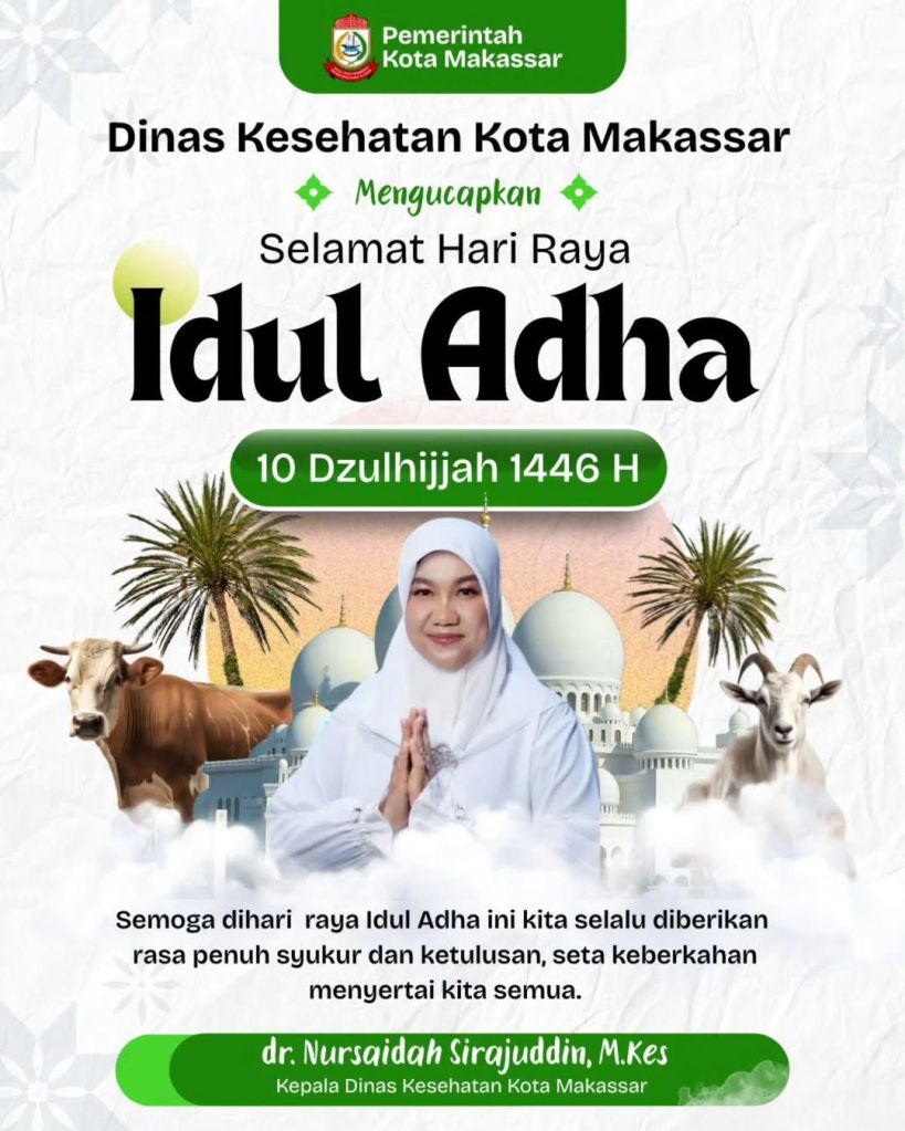 Makassar,—Kepala Dinas Kesehatan Kota Makassar, dr. Nursaidah Sirajuddin, M.Kes., menyampaikan ucapan selamat Hari Raya Iduladha 1446 Hijriah kepada seluruh masyarakat Kota Makassar.