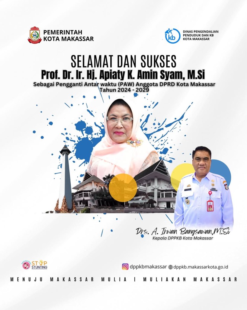 Makassar,-–Kepala Dinas Pengendalian Penduduk dan Keluarga Berencana (DP2KB) Kota Makassar, Drs. A. Irwan Bangsawan, M.Si,, menyampaikan ucapan selamat dan sukses atas pelantikan Prof. Dr. Ir. Hj. Apiaty K. Amin Syam, M.Si, sebagai Anggota Pengganti Antar Waktu (PAW) DPRD Kota Makassar untuk periode 2024-2029.