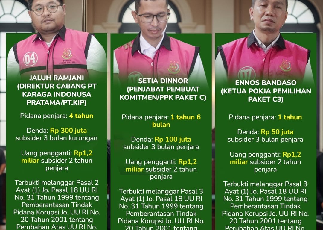 Ketiga terpidana adalah Jaluh Ramjani (Direktur Cabang PT Karaga Indonusa Pratama/PT KIP), Setia Dinnor (Penjabat Pembuat Komitmen/PPK Paket C), dan Ennos Bandaso (Ketua Pokja Pemilihan Paket C3). Mereka terbukti terlibat dalam penyimpangan proyek senilai Rp68 miliar tersebut.