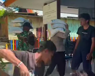 Suasana gotong royong terlihat jelas saat dua warga dengan semangat menyunggi karung beras menuju titik distribusi. “Kami bergotong royong karena ini untuk kepentingan bersama. Meski berat, kami senang bisa membantu,” ujar salah seorang warga sambil menunjuk karung beras di pundaknya.