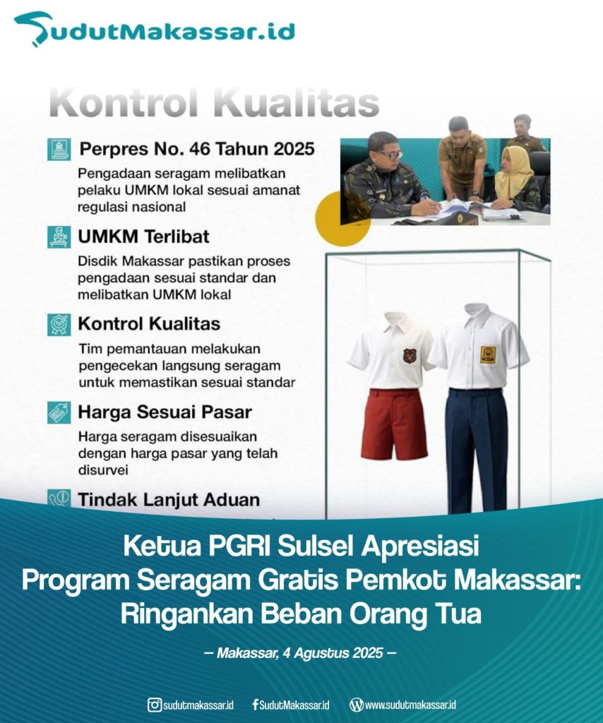 “Program ini meringankan beban ekonomi masyarakat, terutama bagi orang tua yang tergolong kurang mampu,” ujarnya, Ketua Persatuan Guru Republik Indonesia (PGRI) Provinsi Sulawesi Selatan, Prof. Dr. Hasnawi Haris, Senin (4/8/2025).