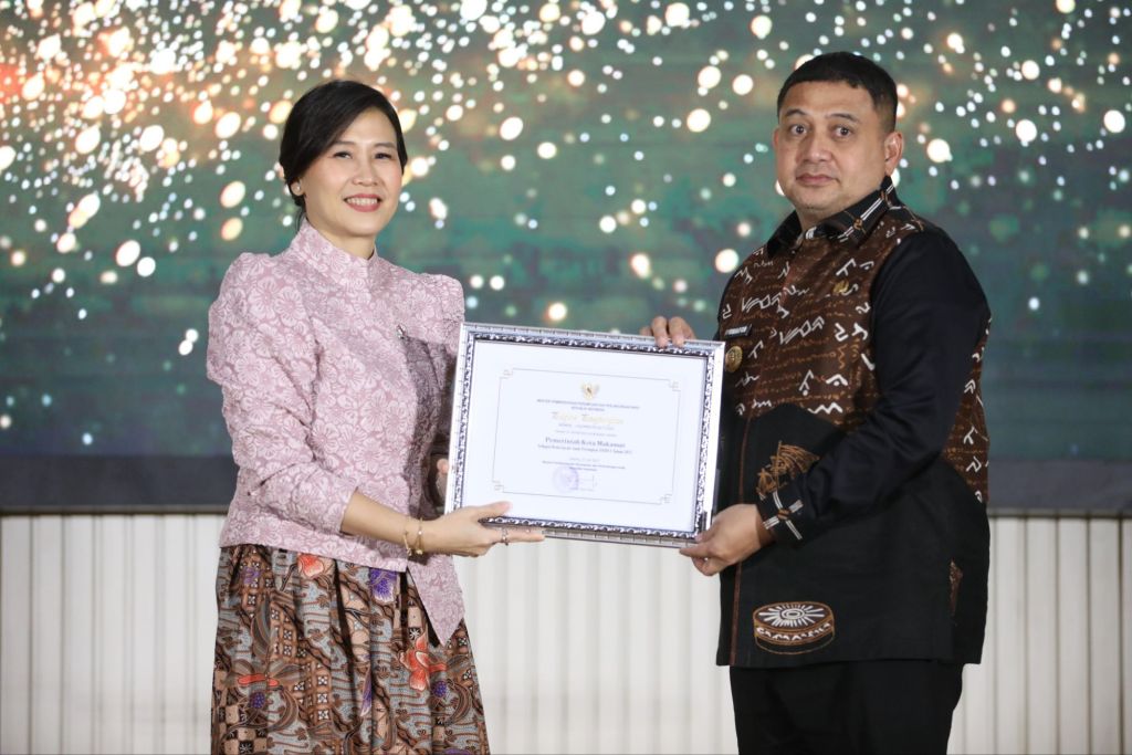 Menteri Pemberdayaan Perempuan dan Perlindungan Anak (PPPA), Arifah Fauzi, diwakili Wakil Menteri Pemberdayaan Perempuan dan Perlindungan Anak Veronica Tan, menyerahkan langsung penghargaan tersebut kepada Wali Kota Makassar, Munafri Arifuddin, hadir Ketua TP PKK Melinda Aksa Mahmud dan Kadis DP3A Makassar, Ita Isdiana Anwar.