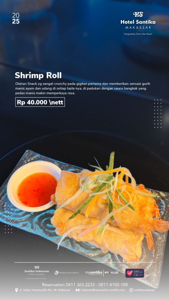 Makassar--Bagi pecinta kuliner yang sedang mencari camilan lezat untuk dinikmati bersama keluarga, Hotel Santika Makassar menghadirkan promo spesial bulan Agustus, yaitu “Shrimp Roll” dengan harga terjangkau Rp 40.000/net. Menu ini terbuat dari perpaduan daging ayam dan udang yang dibalut kulit pangsit garing, memberikan sensasi renyah di setiap gigitan.