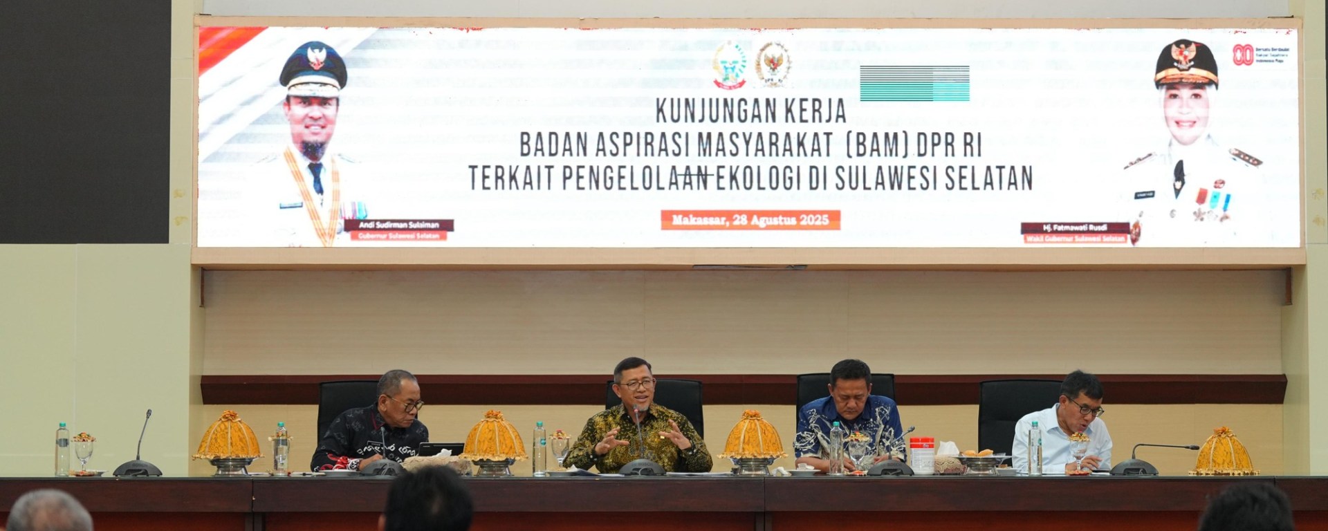 Makassar,–Badan Aspirasi Masyarakat (BAM) DPR RI melakukan kunjungan kerja dalam rangka mendengar aspirasi masyarakat mengenai pengelolaan ekologi di Sulawesi Selatan. Pertemuan berlangsung di Ruang Rapat Pimpinan Kantor Gubernur Sulsel, Kamis, 28 Agustus 2025.