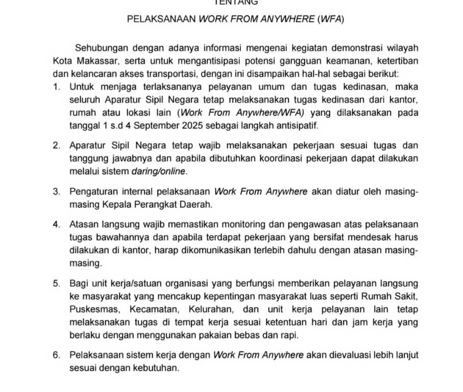 Pertama, ASN Makassar tetap melaksanakan tugas kedinasan dari kantor, rumah, atau lokasi lain (Work From Anywhere) pada 1–4 September 2025.