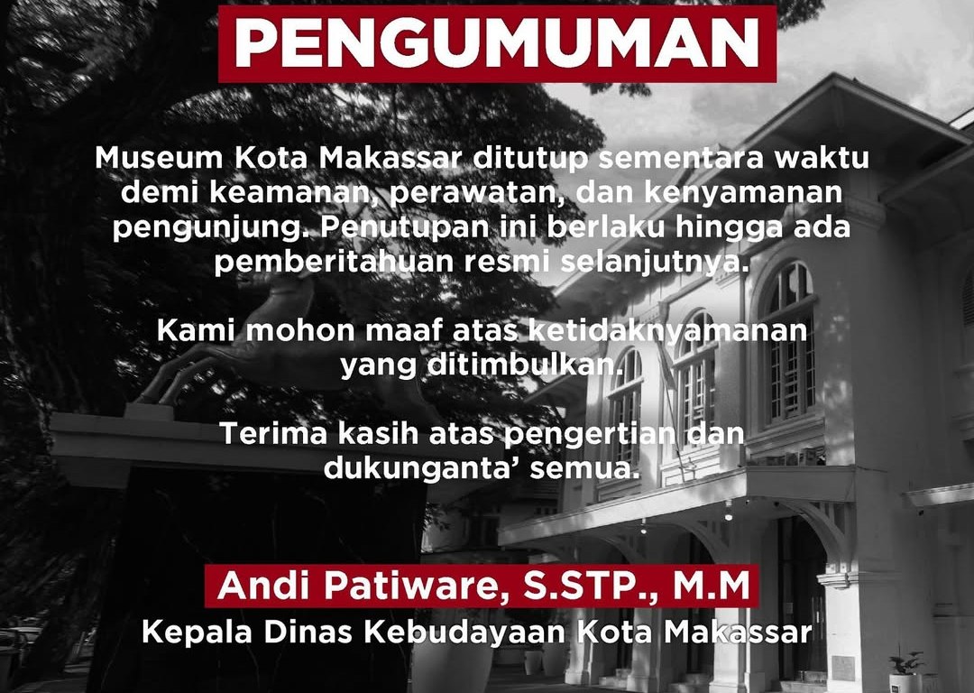 Makassar,–Demi alasan keamanan, perawatan, dan kenyamanan pengunjung, Pemerintah Kota Makassar melalui Dinas Kebudayaan setempat mengumumkan penutupan sementara Museum Kota Makassar.