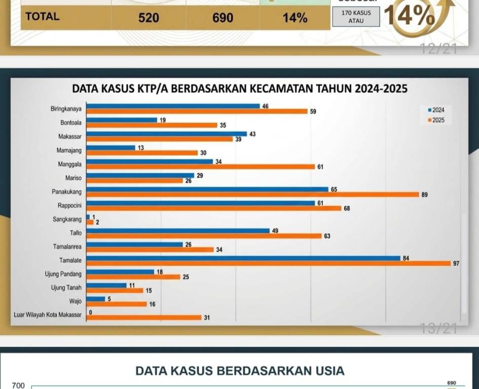 Pada kesempatan ini, diperlihatkan perbandingan data UPTD-PPA 2024–2025. Bahwa secara khusus pada UPTD-PPA Kota Makassar, jumlah kasus meningkat dari 520 kasus pada tahun 2024 menjadi 690 kasus pada tahun 2025.