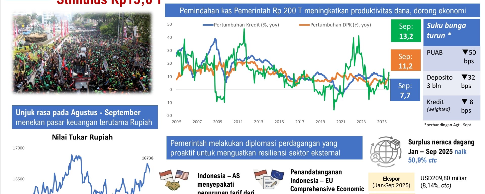 Strategi pengelolaan kas juga dioptimalkan. Penempatan dana pemerintah sebesar Rp276 triliun di bank-bank BUMN berhasil menurunkan suku bunga pasar (JIBOR, IndONIA) dan mendorong pertumbuhan kredit.
