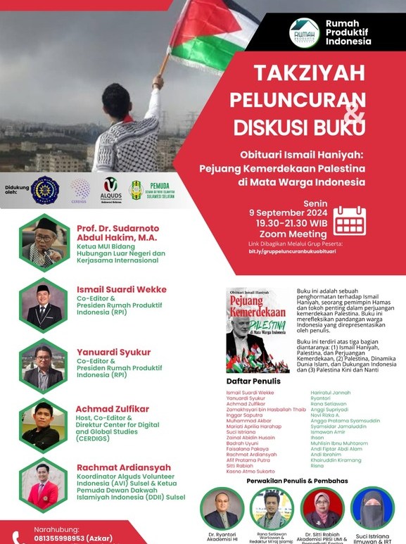 Memgenang 40 hari wafatnya Ismail Haniyah, pemimpin utama perjuangan kemerdekaan Palestina, Perkumpulan Rumah Produktif Indonesia (RPI) didukung oleh Penerbit Universitas Muhammadiyah Barru (Unmuh Barru), Center for Digital and Global Studies (CERDIGS), Alquds Volunteer Indonesia (AVI) Sulsel dan Pemuda Dewan Dakwah Islamiyah Indonesia Sulsel menggelar “Takziyah 40 Hari, Peluncuran dan Diskusi Buku Obituari Ismail Haniyah, Pejuang Kemerdekaan Palestina di Mata Warga Indonesia”. Lanjutkan membaca Takziyah 40 Hari Ismail Haniyah: Penulis Indonesia Luncurkan Buku Obituari Pejuang Kemerdekaan Palestina
